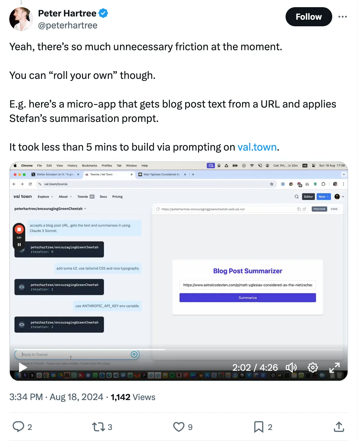 With a handful of prompts, Peter made a neat tool to get Claude to summarize a blog post just by pasting a link.