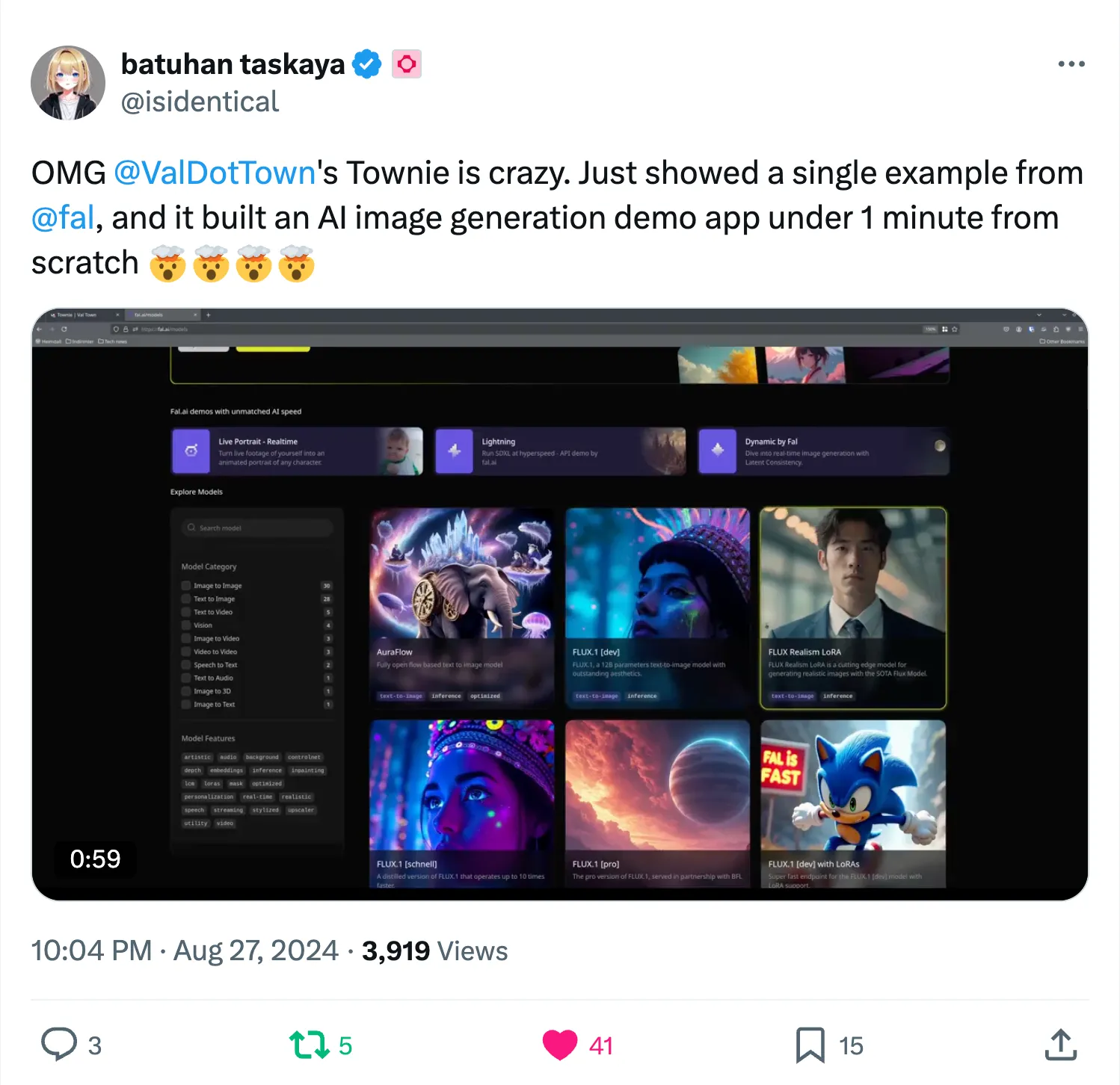 In under a minute and a single prompt, Batuhan built a tool to generate images with Fal AI.
