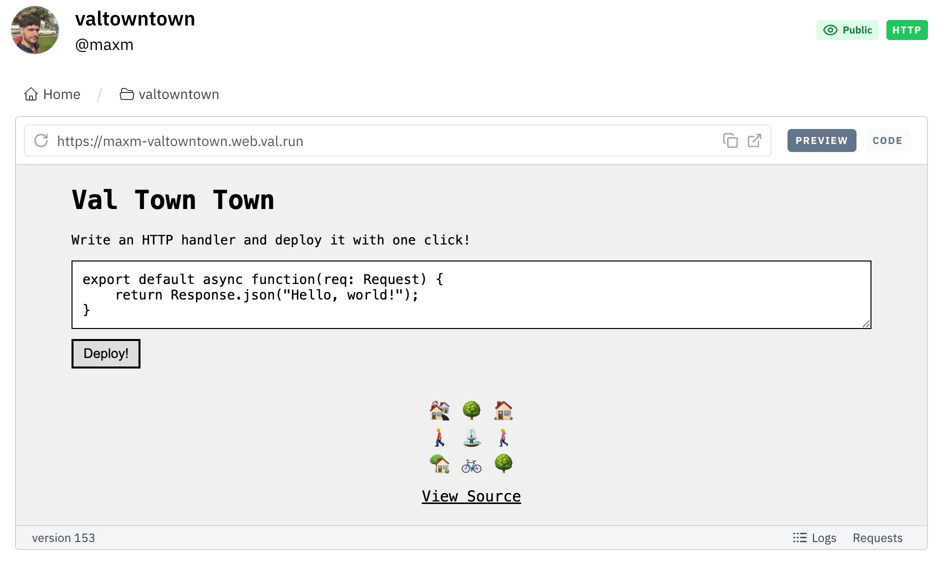 Val Town Town is Val Town implemented on Val Town. Fork it, extend it, build stuff on it, or read on if you’d like to learn more.